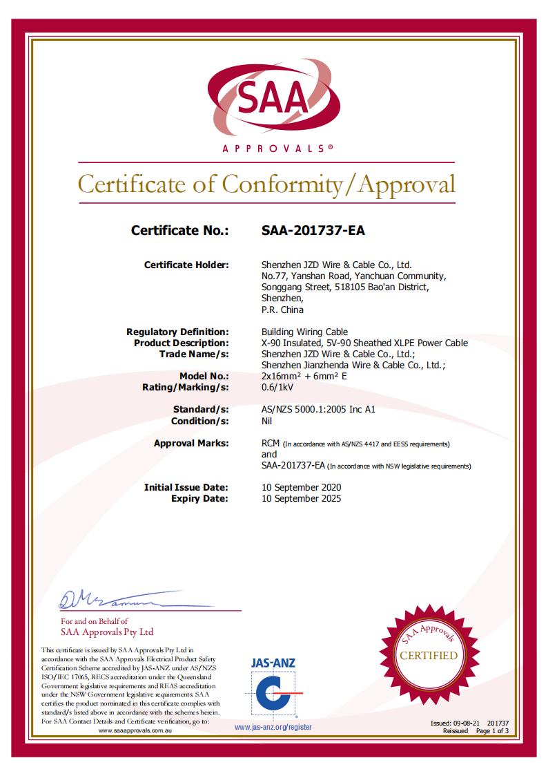 在澳大利亞使用的橙色電力電纜必須符合AS/NZS 5000.1和AS/NZS 3008標(biāo)準(zhǔn),確保它們滿(mǎn)足最高的安全和性能要求。這些標(biāo)準(zhǔn)認(rèn)證包括: